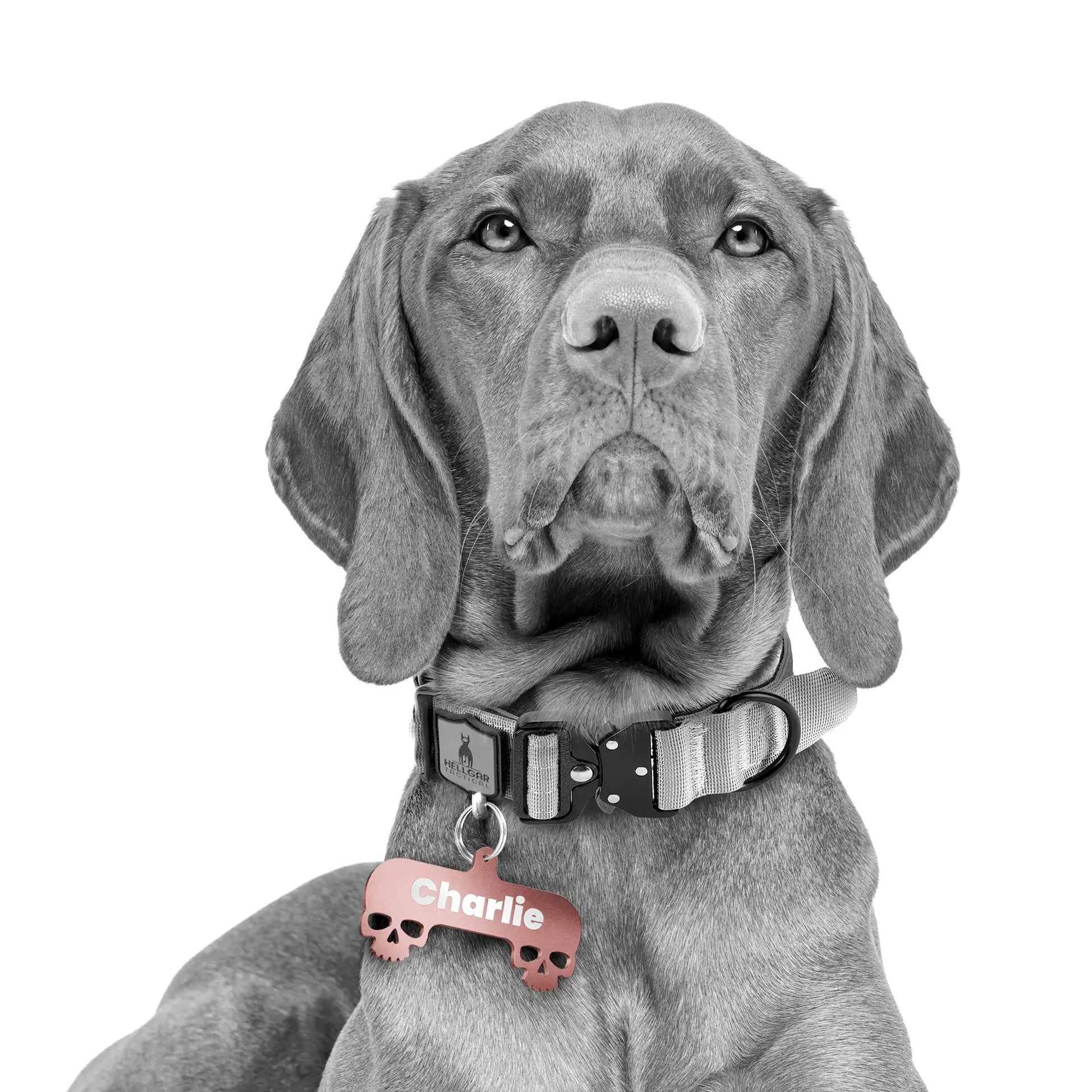Each tag features two precision-engraved skulls flanking a bold center space for your dog’s custom name. The brushed finish gives it a rugged, tactical look that pairs perfectly with your Hellgar harness or collar.